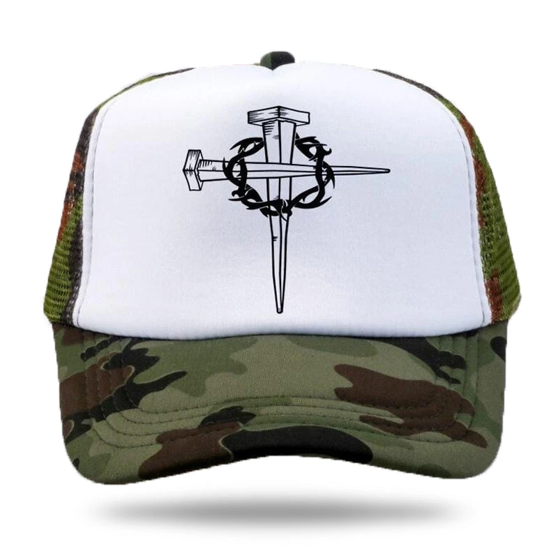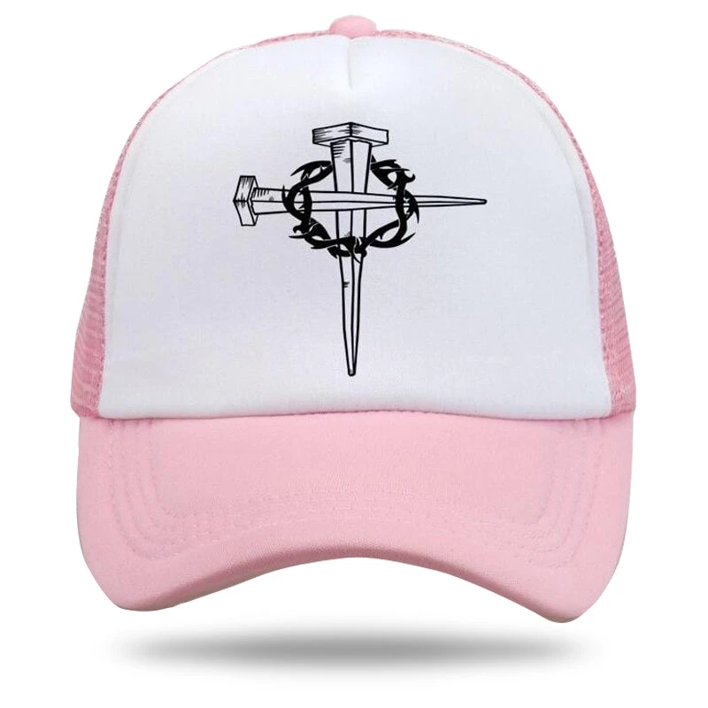 Affirm your faith through your look by wearing this Cross Hat. The symbol is represented by two nails and the crown of thorns.