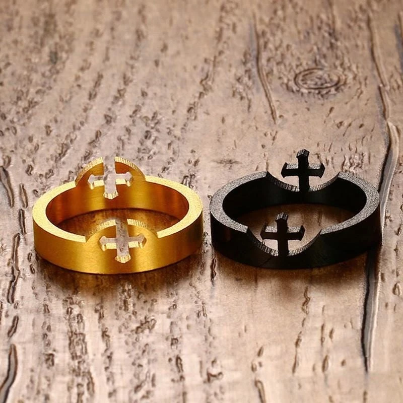 This stunning black and gold cross ring is uniquely designed with two removable parts. Made in stainless steel and gold plated, wear this awesome Christian jewel around your finger.
