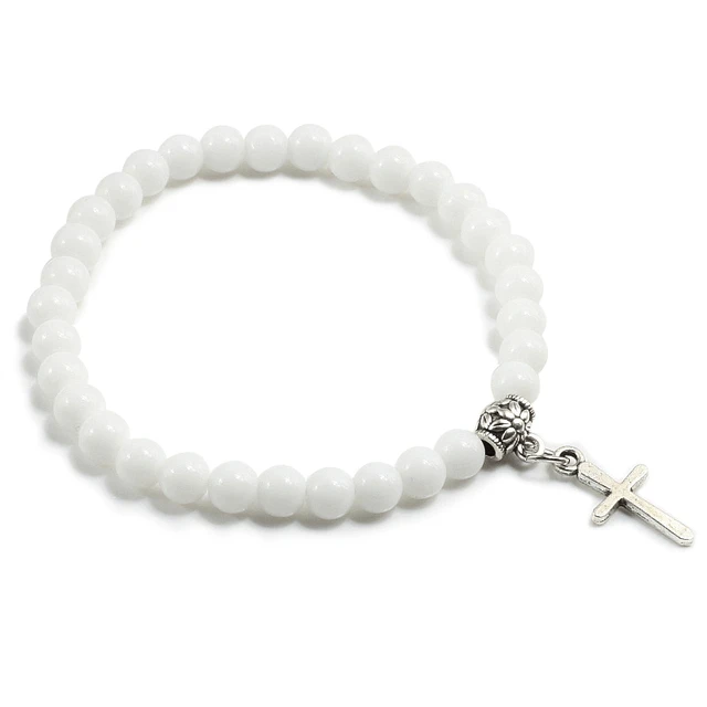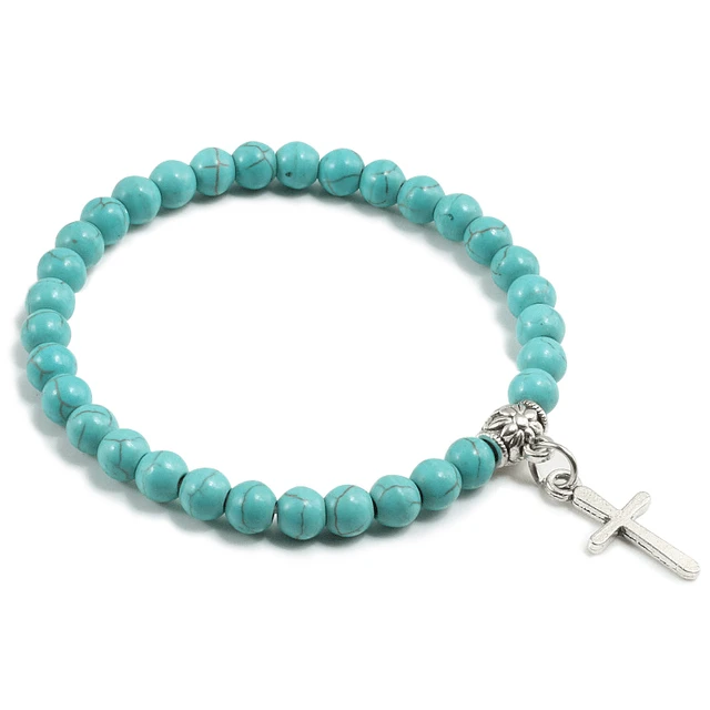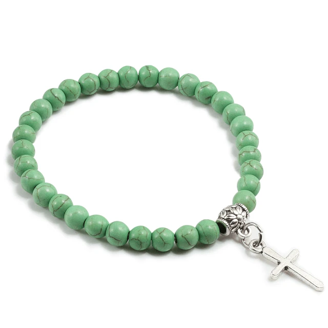 Introducing the Stone Bead Religious Bracelet with Cross Charm, a stunning piece of jewelry that combines natural beauty with religious significance. This bracelet features a beautiful string of stone beads, accented by a silver-tone cross charm at the center. The stone beads have unique natural patterns and colors that add a touch of sophistication and elegance to the bracelet.